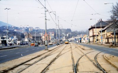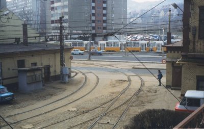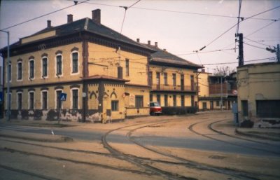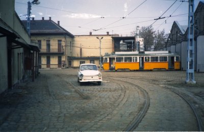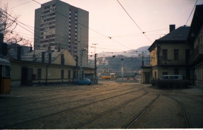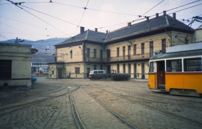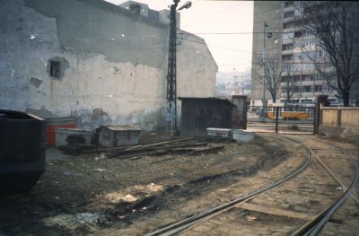 Az 1-es villamos Bécsi úti végállomása, háttérben a kocsiszínnel.